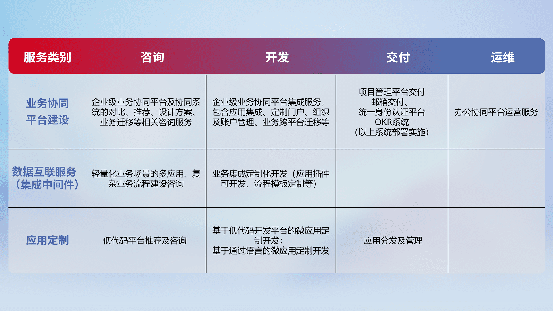 针对钉钉、、企微、、IDaas等平台级产品提供产品的规划、、、方案、、、、交付、、定制化开发等服务,,实现如统一协同办公、、智能客户服务、、、、混合会议管理、、、、智能数据查询、、、、等业务场景,,实现数字化转型。。。